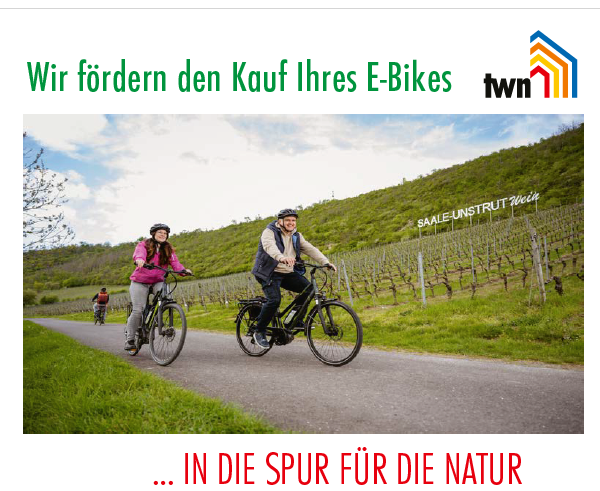 Deshalb fördert die TWN den Kauf Ihres E-Bikes mit 50 €. Voraussetzung ist, dass Sie Stromkunde in einem Sonderstromvertrag bei TWN mit einem Mindestjahresverbrauch von 500 Kilowattstunden pro Jahr sind und Ihr E-Bike bei einem der Naumburger Fahrradhändler erworben haben (Ausnahmen im Einzelfall möglich).